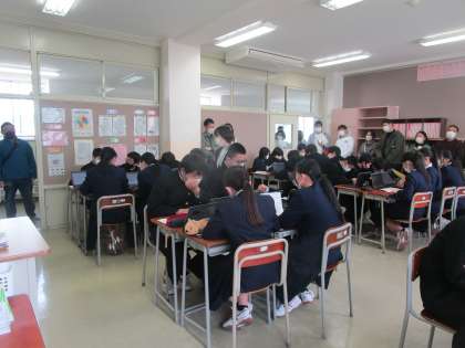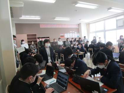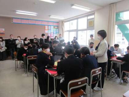 3年生授業参観 公開日 2023/04/23 更新日 2023/04/23 3学年 3年生の授業参観は、「修学旅行の計画を立てよう」という課題で学習していました。各グループどんなコースにするかクロムブックで調べながら相談していました。
