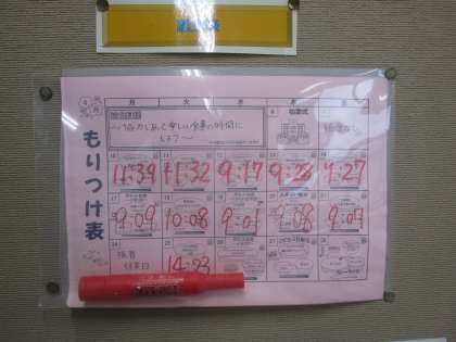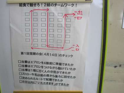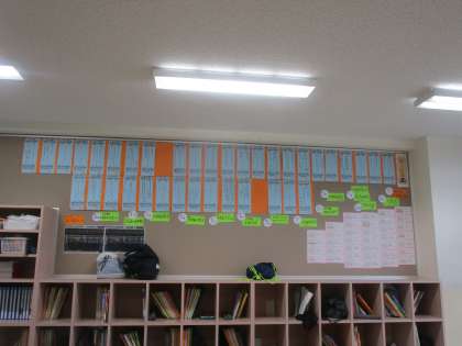 2年2組の教室には、給食準備を早くする方策、背面黒板には個人目標や生徒の誕生日、1年間の行事予定が貼られ、終わった行事に写真を掲示する予定です。頑張れ2年2組