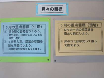 1学年 5月重点目標 公開日 2023/05/10 更新日 2023/05/10 1学年 1学年では、入学して1ヶ月経ち、中学校生活をよりよくするために5月の月目標を生活面、環境面2つずつ作りました。目標を意識し日々生活し、よりよい中学校生活にしていきましょう。
