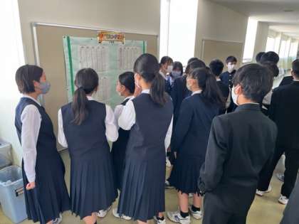 今朝、掲示板の前には多くの生徒が集まっていました。