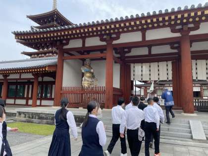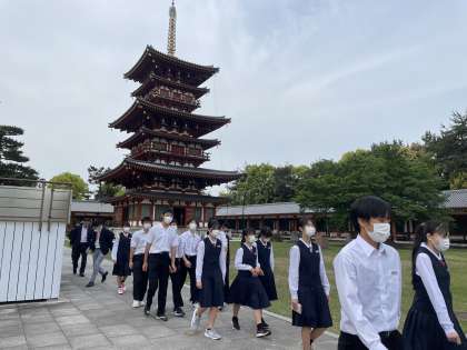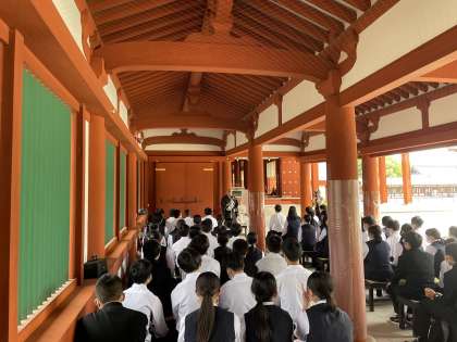薬師寺に来ました。生徒にとって楽しくわかりやすい法話を聞かせていただいています。