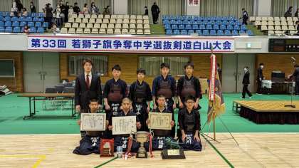 剣道部 若獅子旗争奪中学選抜大会 公開日 2023/05/15 更新日 2023/05/15 部活動 5月14日に若獅子旗争奪中学選抜大会が行われました。 北信越の代表校が集まる中、見事優勝することができました。 引き続き、稽古に励んでいきます。