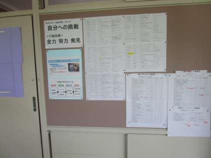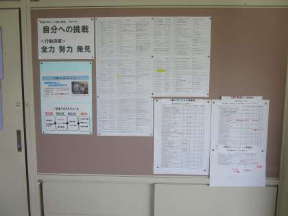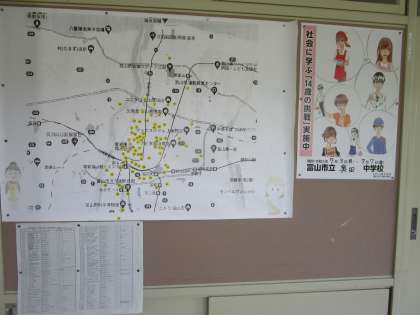 2年生の廊下の掲示板に7月までの流れや事業所の一覧、事業所の場所などが地図にされ掲示されました。