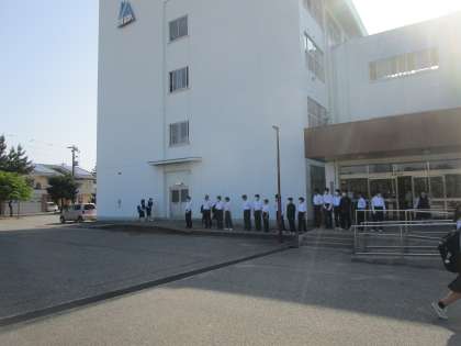 生活委員会による部活動あいさつリレー、サッカー部でした。さわやかな男子の挨拶が元気よく交わされていました。