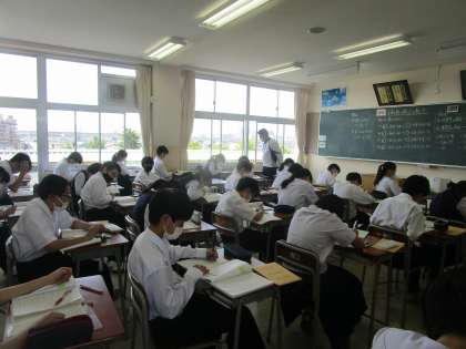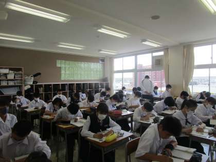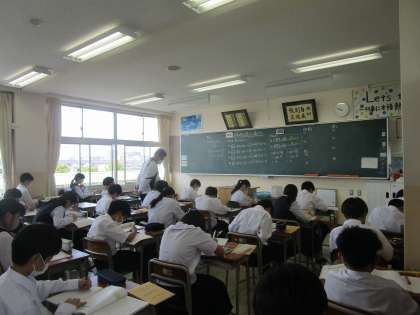 1年5組 数学 公開日 2023/05/17 更新日 2023/05/17 1学年 5月17日(水)2限 1年5組の数学は、「正負の数の除法の考え方」を学習していました。先生が巡回して理解しているか確認していました。