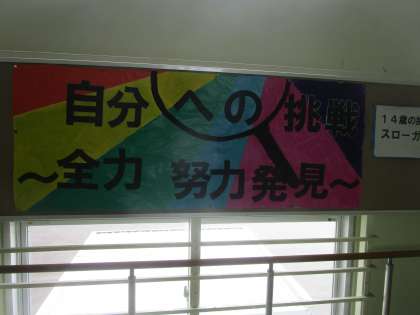 14歳の挑戦に向けて、廊下、階段踊り場にスローガンが掲示されました。挑戦までこのスローガンを意識して準備を進めます。