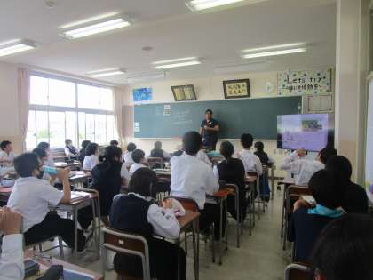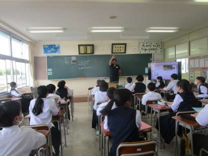 1年5組の英語は、「〜することができる」について学習していました。生徒も積極的に授業に参加していました。先生とユーモア、ジェスチャーいっぱいに授業していました。