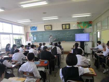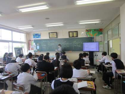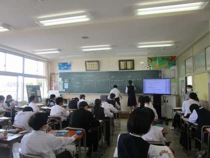 1年4組の英語は「can」の肯定文、否定文、疑問文について復習していました。班の代表が解答を黒板に書いていました。書かれた英文を先生が確認しながら説明していました。