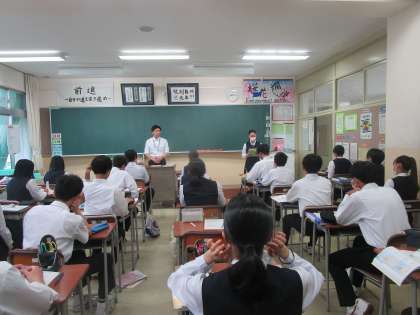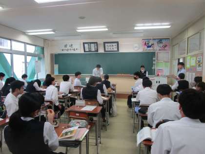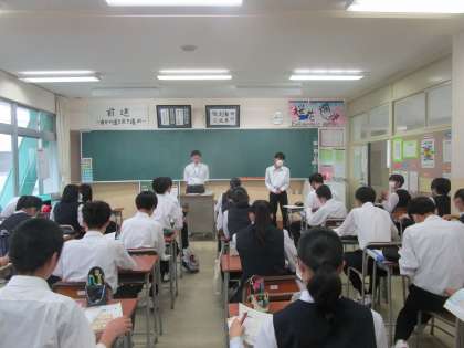 教育実習生さんが頑張っています 公開日 2023/05/26 更新日 2023/05/26 3学年 5月22日(月)から教育実習生3名が実習に来ています。3年3組では朝学活の進め方、指導を実践していました。教員の様々な職務を経験しています。