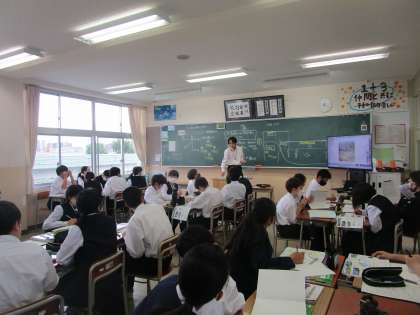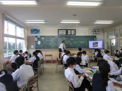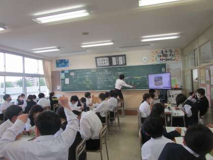 1年3組 社会 公開日 2023/05/26 更新日 2023/05/26 1学年 5月26日(金) 1年3組の社会は、「日本の領域とその特色」について学習していました。画面や地図帳で確認しながら先生の質問に答えていました。
