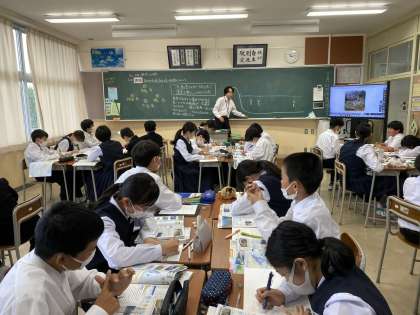 1年2組社会 公開授業 公開日 2023/05/26 更新日 2023/05/26 1学年 2限社会は、若手の先生が授業の進め方を研修するために、校内の先生に公開されました。 たくさんの先生が参観する中で、生徒たちは落ち着いて授業に取り組んでいました。