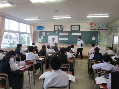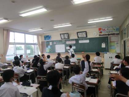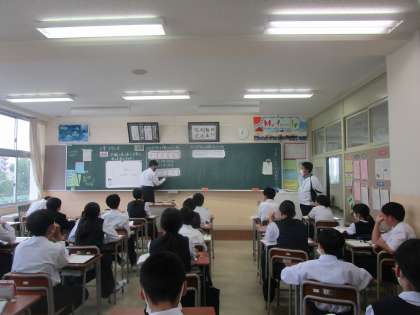 1年2組 数学 公開日 2023/05/29 更新日 2023/05/29 1学年 5月29日(月)4限 1年2組の数学は、文字と式で「本棚のそこの下に必要な棒の本数を求めよう」という課題で学習していました。いくつかの解き方を生徒が黒板の前に出て説明し、みんなでその考え方を確認していました。