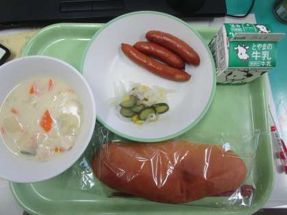 本日の給食は、コッペパン、牛乳、粗挽きウィンナー、大根サラダ、クリーム煮でした。