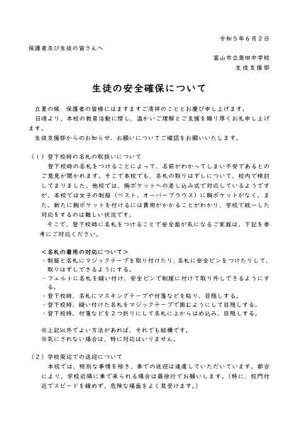 生徒の安全確保について 公開日 2023/06/02 更新日 2023/06/02 学校だより 本日、お子様を通して生徒の安全確保のプリントを配布しました。登下校時の名札の取扱いと学校周辺での送迎についてです。お読みいただき、確認ください。