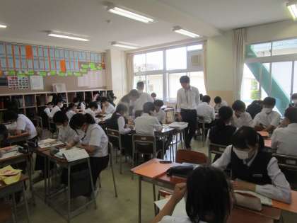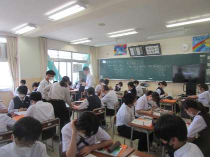 2年2組は教育実習の先生が授業をしていました。「質量比を使いこなそう」という課題で学習していました。グループを巡回して先生と一緒にアドバイスしていました