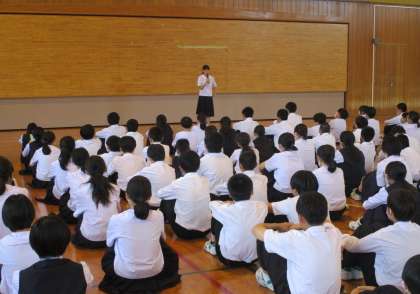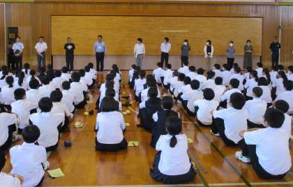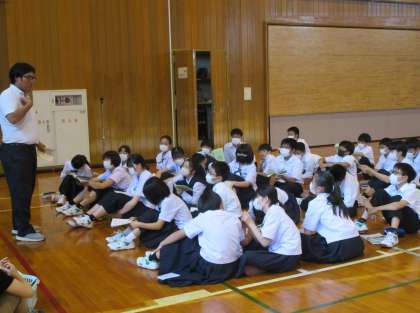 7日、8日の二日間で行われる1年生宿泊学習の結団式が行われました。代表生徒の決意表明や引率の先生方の紹介、係別の打ち合わせを行いました。