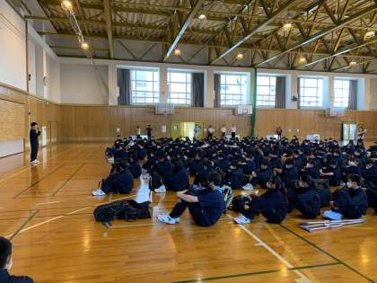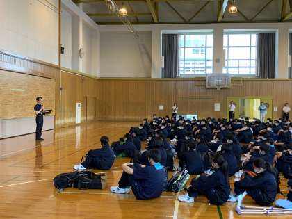 1学年の宿泊学習が始まります。出発式では、代表者が話をし、意気込みを語りました。
