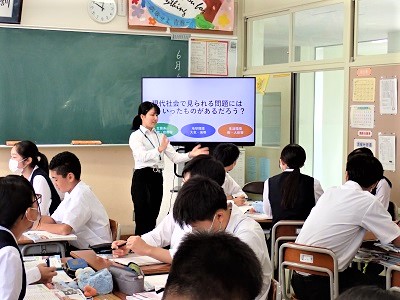 教育実習生の授業 公開日 2023/06/07 更新日 2023/06/07 学校だより 6月7日(水)2限 3年1組で、教育実習生が社会の授業を行いました。「経済の発展は生活にどのような影響を与えたか」について学習しています。指導者が用意した動画を視聴し、経済発展がもたらした光と影について3つの観点から考え、班で話し合っています。