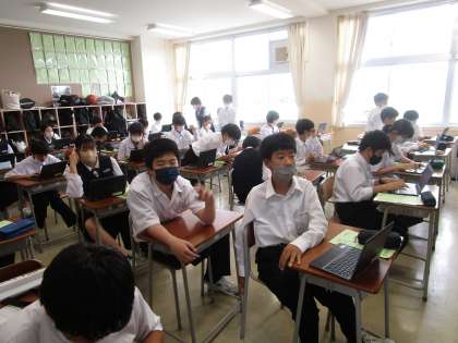9日(金) 1年授業風景(1) 公開日 2023/06/09 更新日 2023/06/09 1学年 宿泊学習が終わり、生徒たちには少し疲れも見られますが、がんばって授業に取り組んでいます。写真は4限の様子です。 〈1組:美術、2組:学活、3組:英語〉