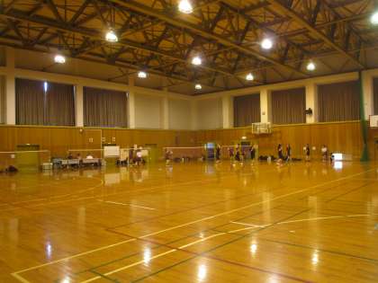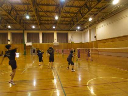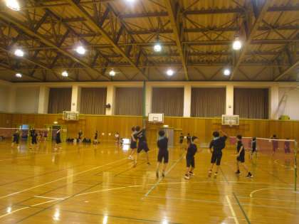 男女バドミントン部が体育館前面を使って大会前の休日の練習です。フットワークを頑張っていました。