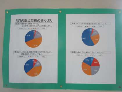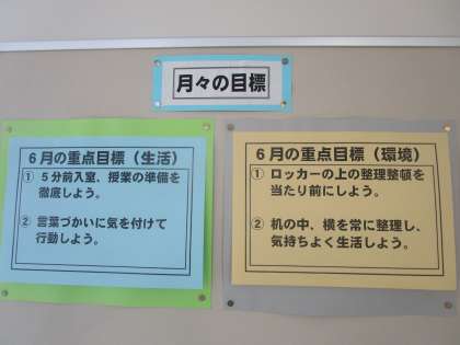 1年生の廊下の学年掲示板に6月の目標と5月の振り返りが掲示されました。1ヶ月ごとにレベルアップを学年で図っています。5月の振り返りも行い、学年・学級や個々がよりよい生活を送れるよう頑張っています。