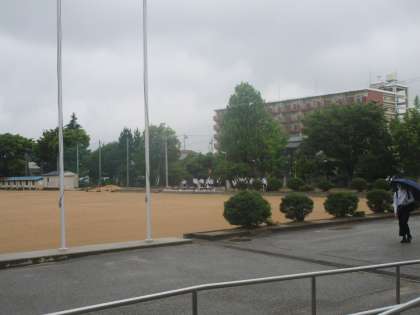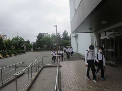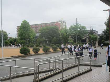梅雨空の中、生徒が登校していました。