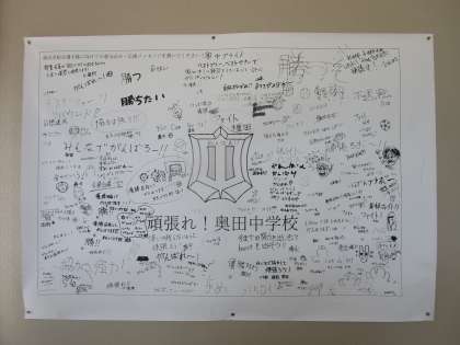 いよいよ明日が富山市総合選手権大会です。生徒会で生徒玄関のFace boardに富山市総合選手権大会に向けての意気込み・応援メッセージを書く企画をしてくれました。たくさんの生徒や先生が、各部の応援や意気込みを書いてくれました。登下校時、生徒も書き込んだり、見てくれたりしてくれています。