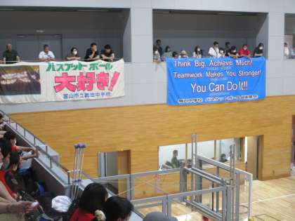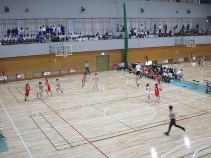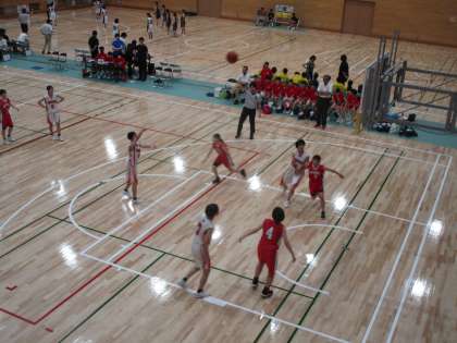 富山市総合選手権大会 女子バスケットボール準決勝 公開日 2023/06/19 更新日 2023/06/19 部活動 6月18日(日)9時 2000年体育館で女子バスケットボールの準決勝が行われました。2枚の横断幕、保護者の方も赤の応援Tシャツで応援しています。