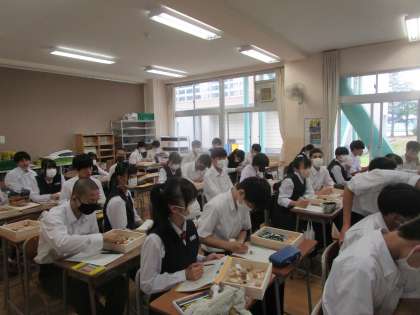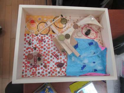 3年5組の美術は、アッサンブラージュをしていました。箱の中に自分が持ってきた小物を並べて、自分だけの世界、作品を作っていました。作品を鑑賞できるのを楽しみにしています。