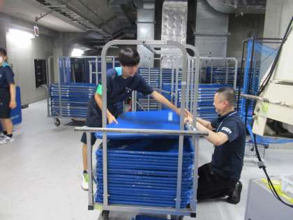 体育館備品の仕分けをしています。職員の方の指示に従って、丁寧に作業していました。