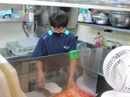 食器を下げたり、洗い物をしたりしています。慣れない立ち仕事ですが、やる気満々で頑張っています!