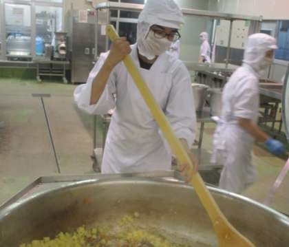 北学校給食センターでは、およそ5100食作られているそうです。奥田中メニューの、肉じゃがの工程を担当させていただきました。大きなお鍋にしゃもじ。力仕事頑張っています!