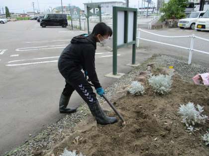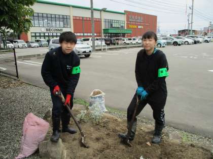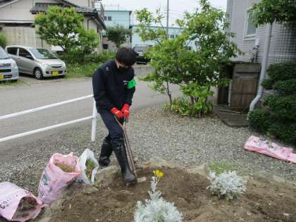 花壇に生えていた雑草をとり、土の中に埋まっている根を丁寧にとりはらっていました。真剣に取り組んでいます。