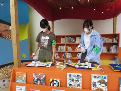 清掃をしたり子どもたちが読む本や遊具の消毒をしたりしていました。体験コーナーでさまざまな体験もさせていただきました。
