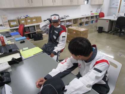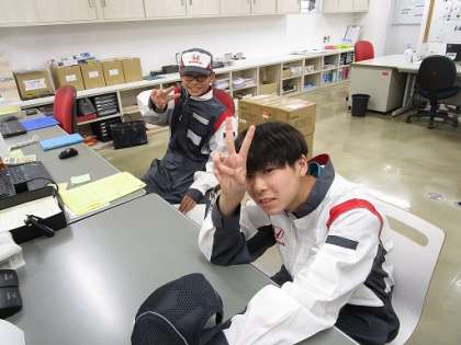 タイヤ交換の体験や、窓ガラスの交換作業等を見学させていただきました。制服が似合っていますね。