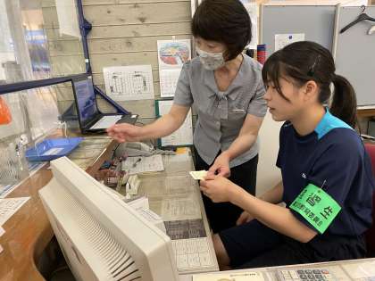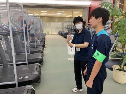 トレーニング室で受付業務や、器具の貸し出しを行っています。利用者の方に元気な声で挨拶をしていました。