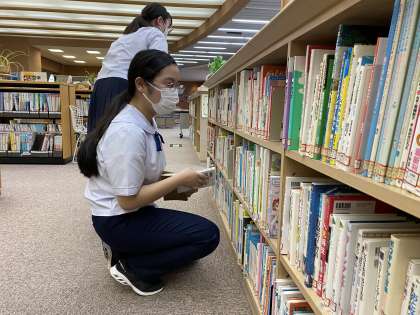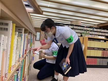 返却された本を元の場所に戻しています。探すのに苦戦していました。