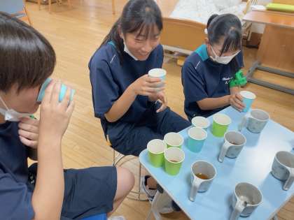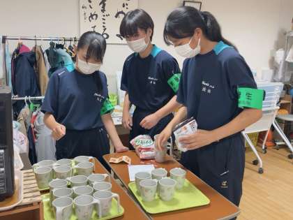利用者さんの飲み物にとろみをつける目的を教えていただき、実際に飲んで、元のお茶との違いを体験していました。その後、実際に飲み物を用意していました。