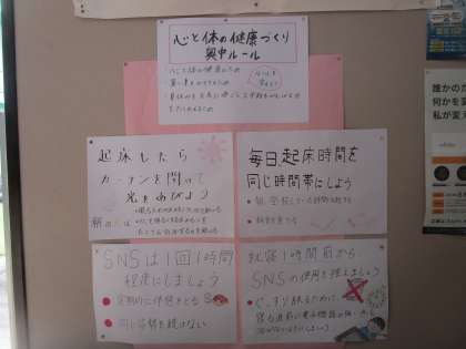 心と体の健康づくり 奥中ルール 公開日 2023/07/10 更新日 2023/07/10 生徒会 厚生委員会で「心と体の健康づくり 奥中ルール」が生徒玄関のFace boardに掲示されました。 ・起床したらカーテンを開けて光を浴びよう ・毎日、起床時間を同じ時間帯にしよう ・SNSは1回、1時間程度にしましょう ・就寝1時間前からSNSの使用を控えましょう