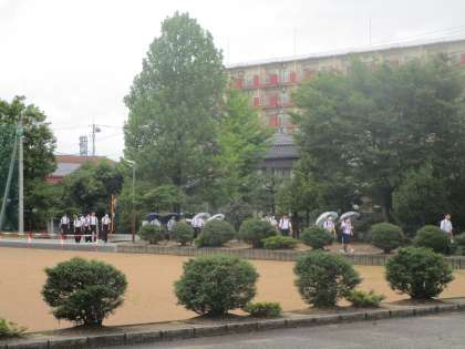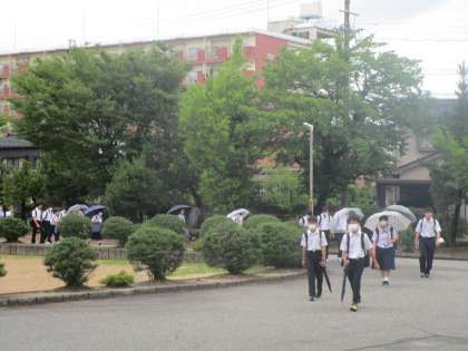 登校途中に少し雨が降り、傘を差している生徒もいました。午前中は降ったりやんだりのようです。