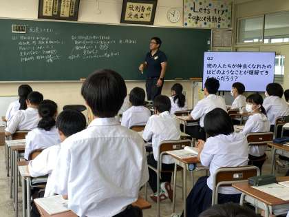 1年5組道徳公開授業 公開日 2023/07/15 更新日 2023/07/15 学校だより 7月14日(金)2限 1年5組の生徒はよく集中し、一生懸命考えて生き生きと発言していました。他の生徒の考えを認め合う、温かい雰囲気の中で学習が進められました。