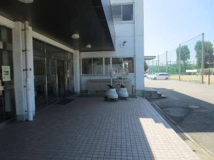 生徒玄関に大型ミスト扇風機2台で熱中症対応しています。休憩時にミストを浴びて暑さをしのいでいます。テニスコートではホースを使ってミスト代わりに、体育館横の水道の水を溜めて顔を洗ったり、体に水をつけて暑さをしのいでいます。