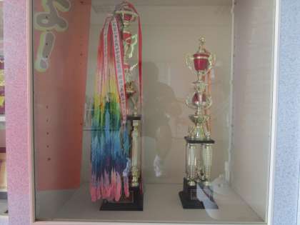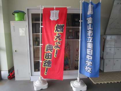 来賓玄関に奥田中学校応援のぼり旗、「富山市立奥田中学校」、「燃えよ!奥中魂!」を準備しました。来賓玄関には全中2位のトロフィが棚に入れられ、飾られています。奥田中学校バスケットボール部の先輩方も応援しています。男子部員37名で明日、明後日と頑張ってくれることを期待しています。