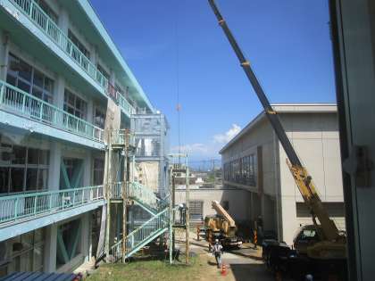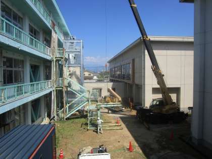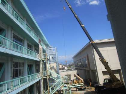 テレビで見るような解体作業です。古い非常階段を部分的に解体し、クレーンで降ろしています。