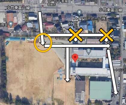 下校時、夜間の送迎、土日の部活動の送迎については近隣の生活道路(武道館正面、東側、体育館横)を使用せず、正門及びテニスコート側から乗り入れしてください。