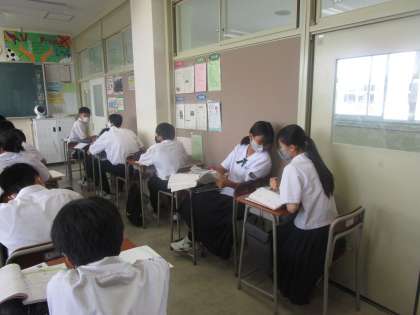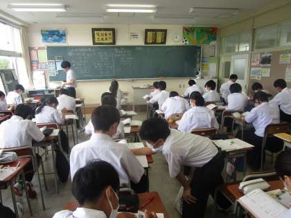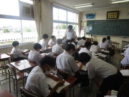 1年4組 数学 公開日 2023/08/31 更新日 2023/08/31 1学年 8月31日(木)1限 1年4組の数学は、「いろいろな方程式を解こう」という課題で学習していました。解き方を近くの生徒と教え合ったり、答えを確認し合ったりしていました。