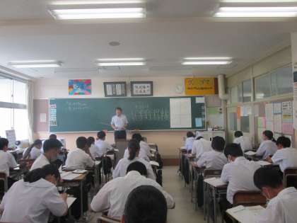 2年4組 数学 公開日 2023/08/31 更新日 2023/08/31 2学年 8月31日(木)3限 2年4組の数学は、「y=ax+bのグラフ」の学習をしていました。問題を解いて教科書を先生に見せてチェックしてもらっていました。