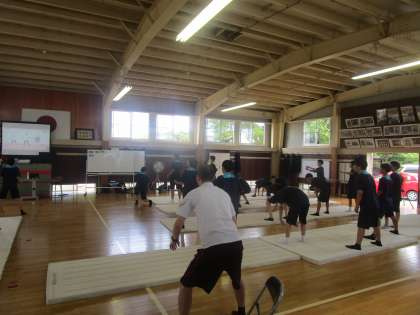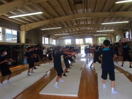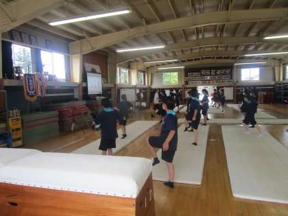 2年2組 保健体育 公開日 2023/09/01 更新日 2023/09/01 3学年 9月1日(金)4限 2年1組の保健体育は武道館で体つくり運動をしていました。動画を見ながら体つくりをしていました。