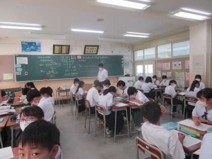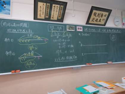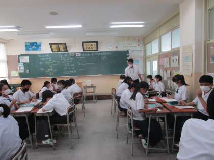 1年1組 数学 公開日 2023/09/07 更新日 2023/09/07 1学年 9月7日(木)6限 1年1組の数学は、「方程式を利用して速さ、時間、距離の関係を考えよう」という課題でグループで教え合いながら問題に取り組んでいました。