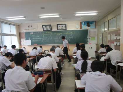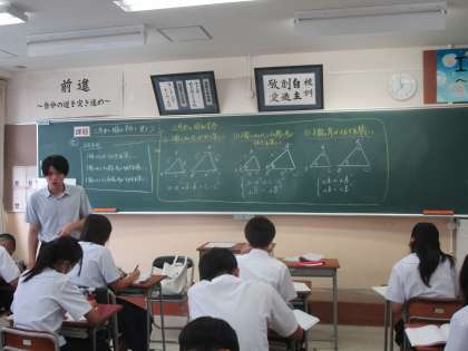 3年5組 数学 公開日 2023/09/11 更新日 2023/09/11 3学年 9月11日(月)4限 3年5組の数学は「三角形の合同条件」が黒板に書かれ、ノートに描き写していました。先生からはとても大事なので覚えるよう言われていました。